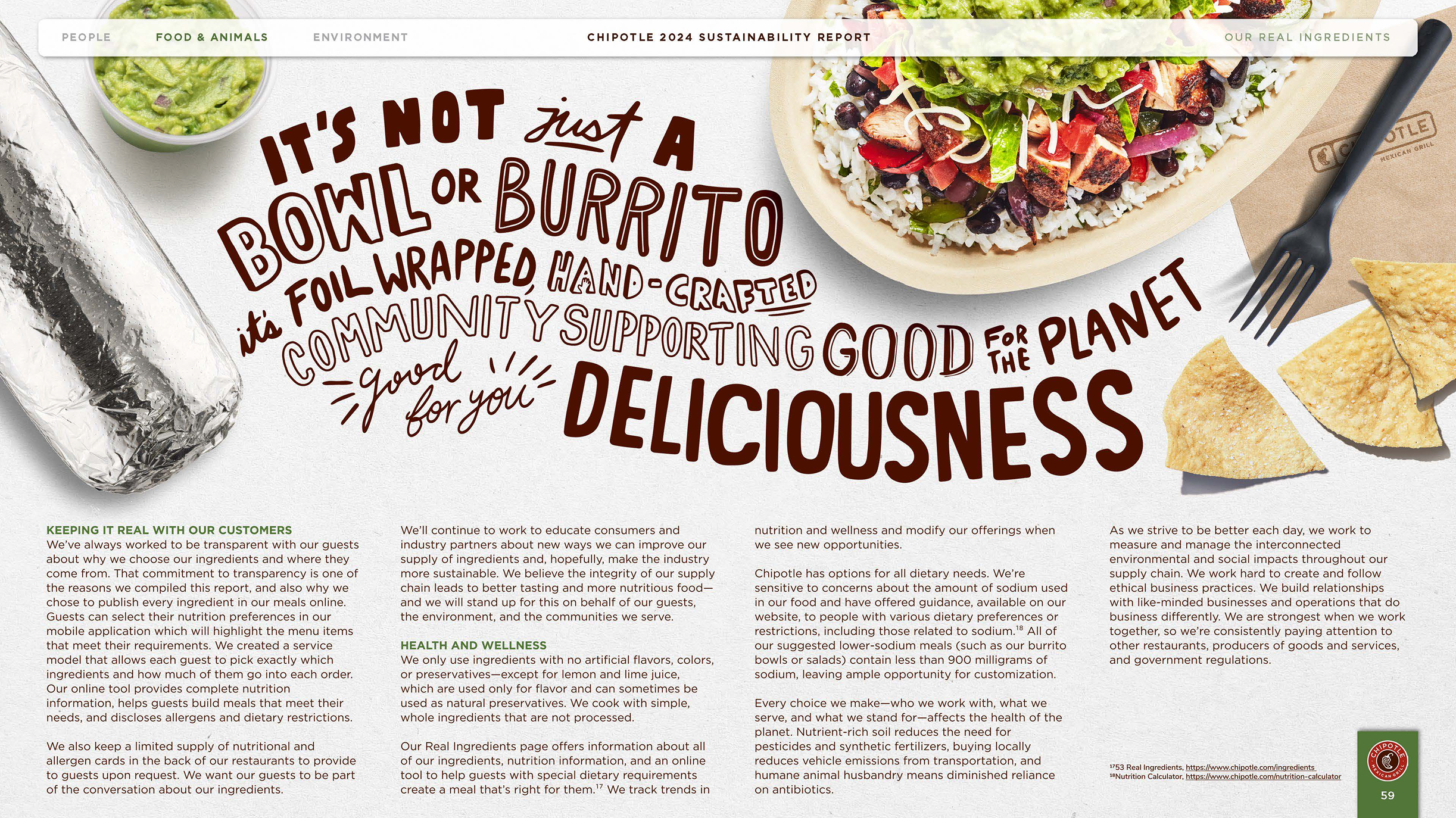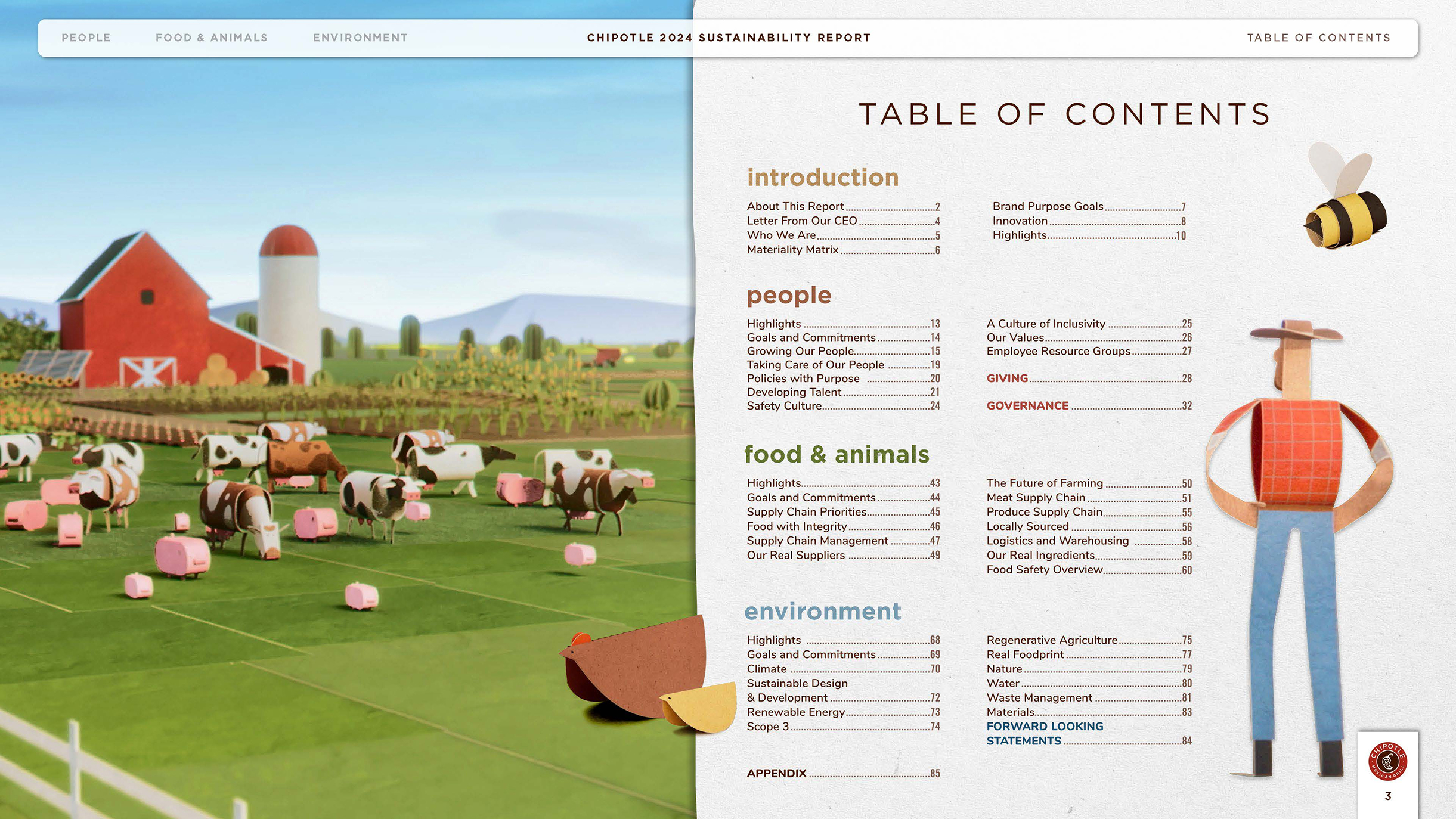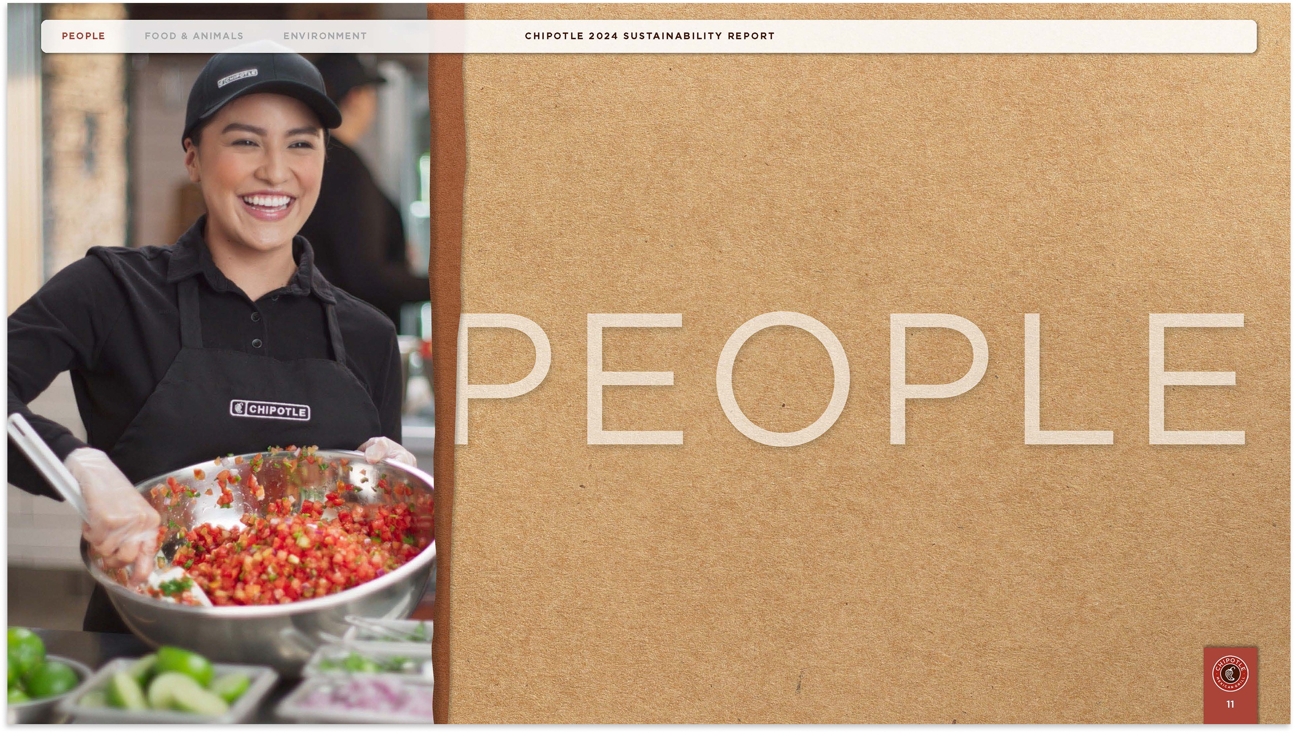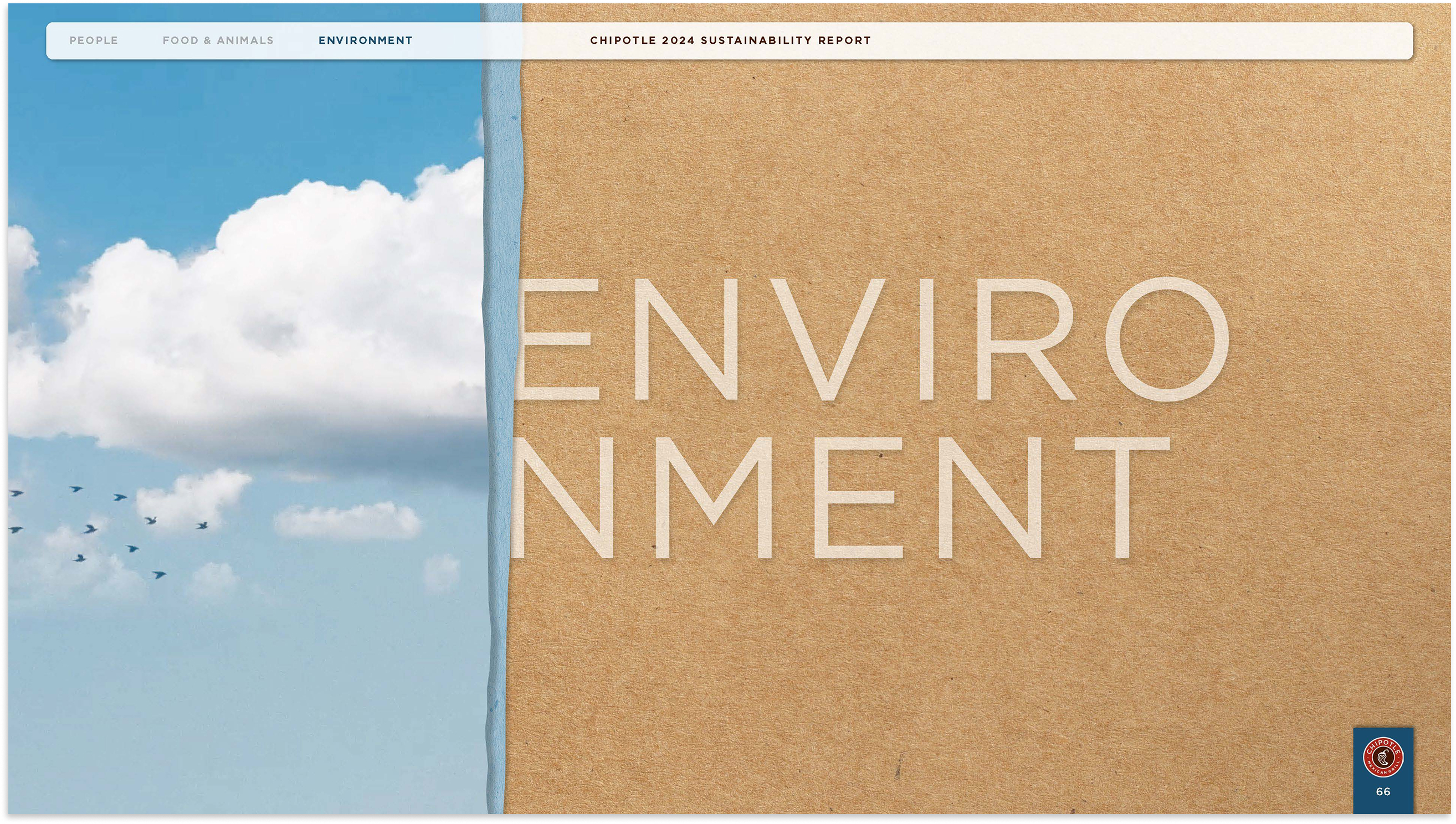 The 2024 Chipotle Sustainability Report outlines Chipotle's impact, progress, and goals across three critical areas: Food and Animals, People, and the Environment.This report embodies the brand’s mission to Cultivate a Better World. Inspired by Chipotle's 2025 creative campaign, Unfolded, the report's look and feel draws from the paper textures featured throughout the film, paired with colors inspired by real ingredients and textures from Chipotle's sustainable packaging materials. Together, these elements unfold the story of Chipotle's impact through a lens that's as authentic as the ingredients themselves.