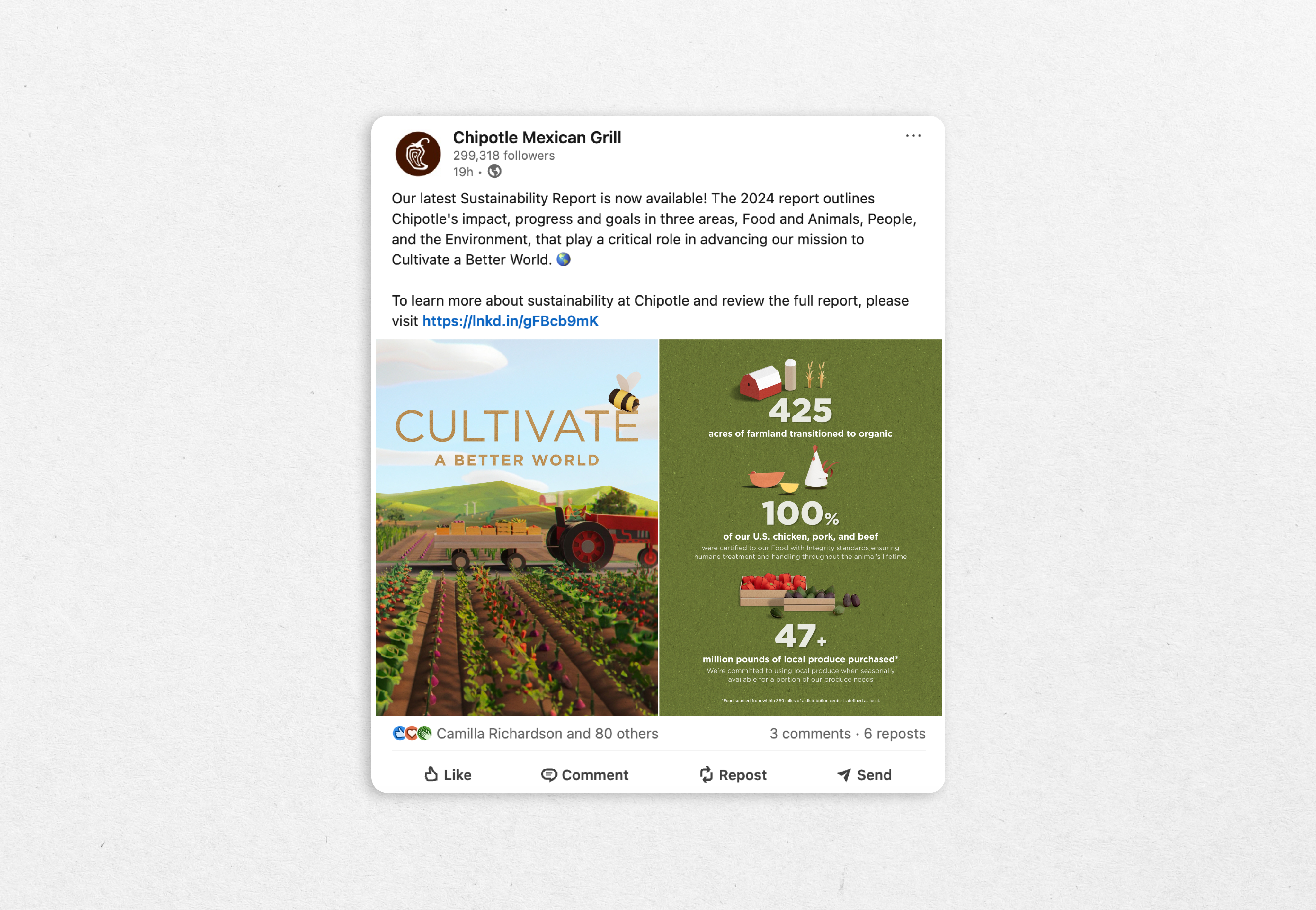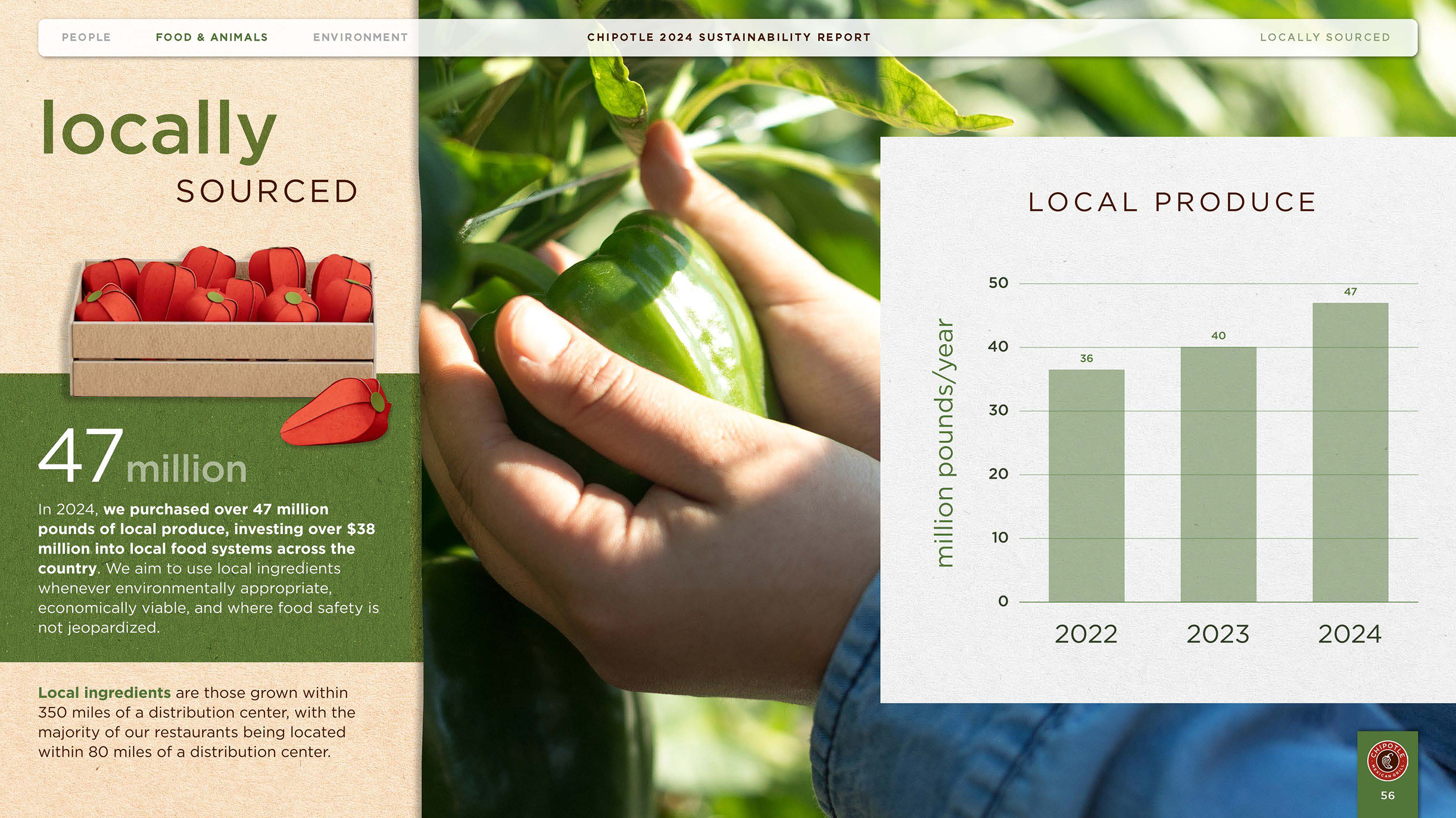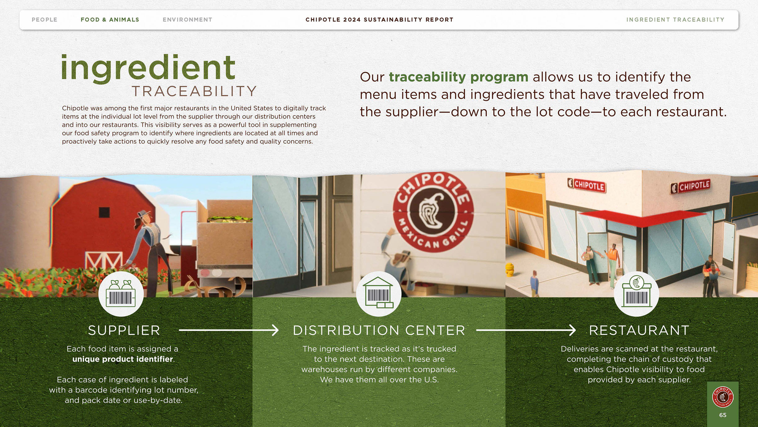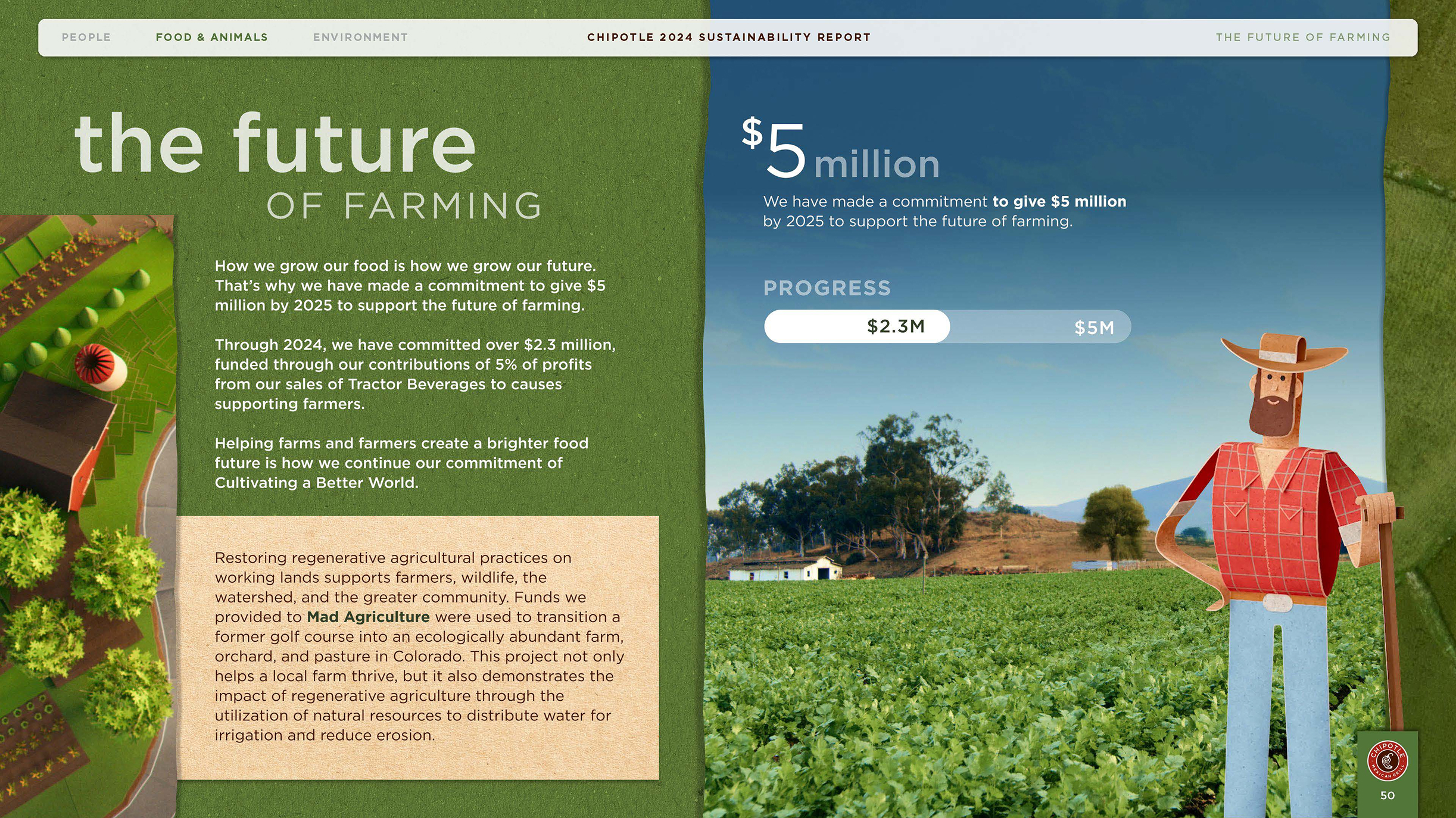 The 2024 Chipotle Sustainability Report outlines Chipotle's impact, progress, and goals across three critical areas: Food and Animals, People, and the Environment.This report embodies the brand’s mission to Cultivate a Better World. Inspired by Chipotle's 2025 creative campaign, Unfolded, the report's look and feel draws from the paper textures featured throughout the film, paired with colors inspired by real ingredients and textures from Chipotle's sustainable packaging materials. Together, these elements unfold the story of Chipotle's impact through a lens that's as authentic as the ingredients themselves.
