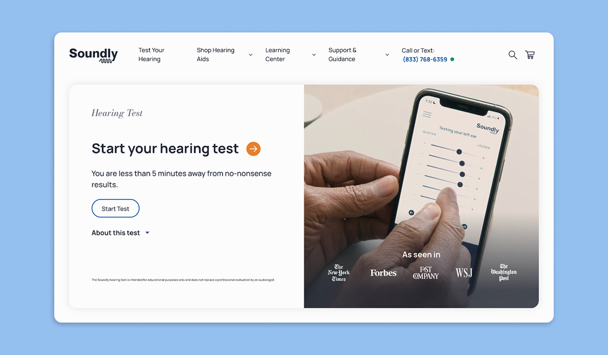 Shopping for hearing aids has historically been a time-consuming, confusing, and frustrating process. As it stood, there was no digital experience in existence for consumers to successfully test their ears and shop for hearing aids online. Soundly CEO and Founder Blake Caldwell aimed to radically change that by helping consumers find what they need using modern, consumer-friendly technology.AGENCY