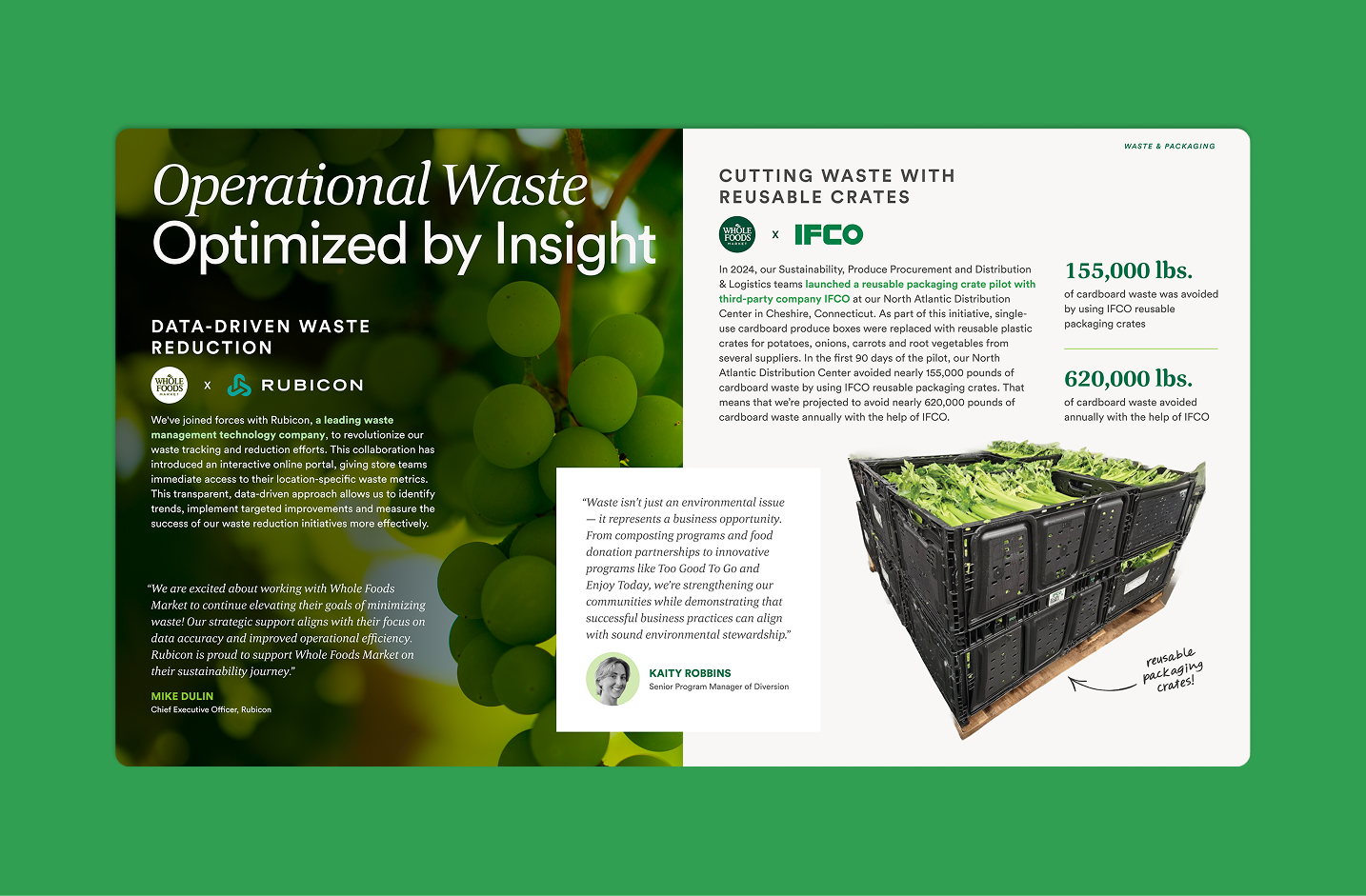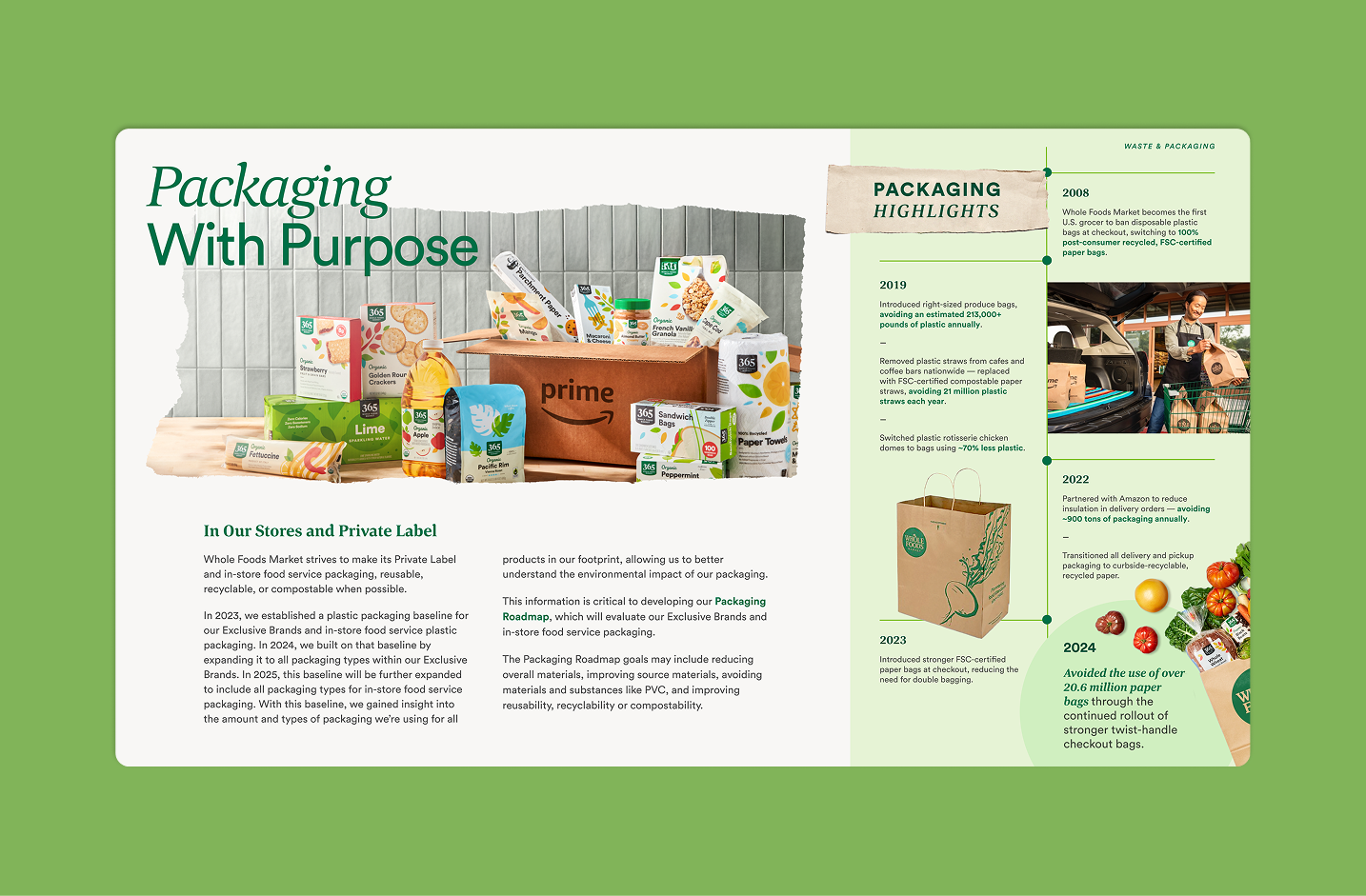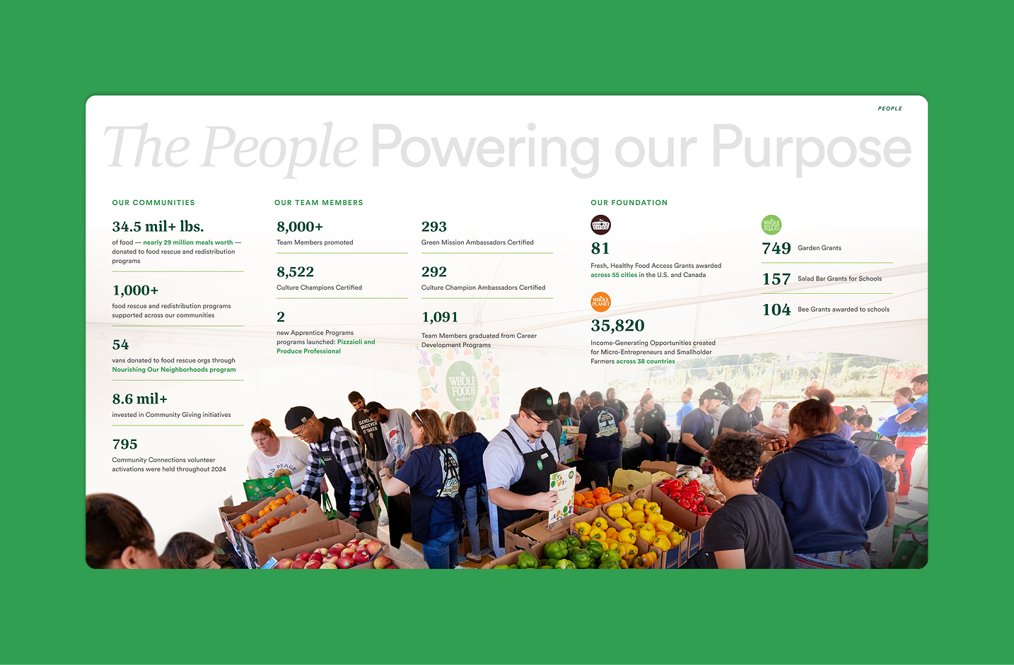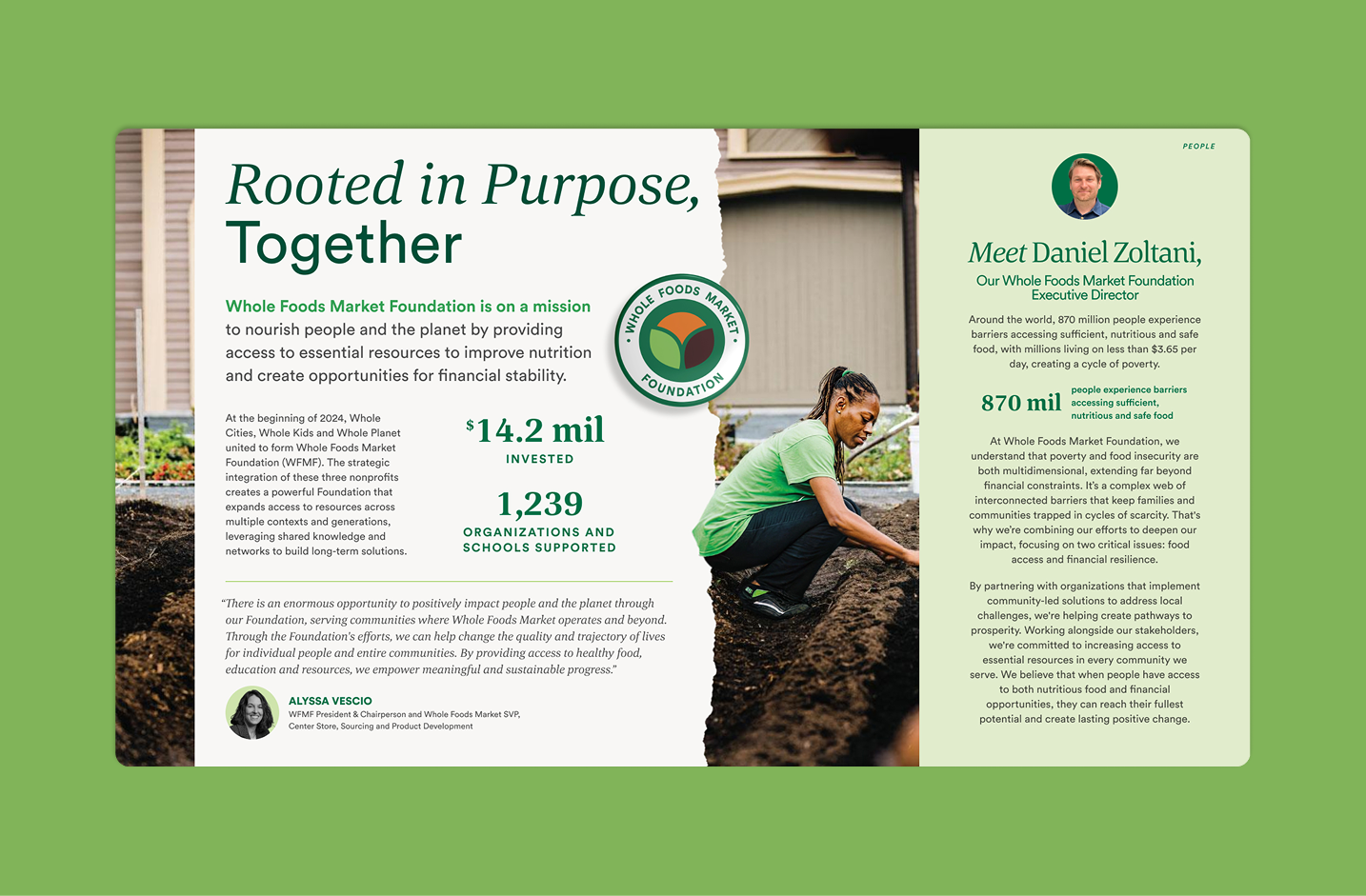 Collaborated with a fellow Brand Designer on the 2024 Whole Foods Market Impact Report, creating custom hand-drawn lettering throughout the report. Sourced imagery and designed timelines, infographics, and data visualizations to enhance storytelling and improve data clarity.AGENCY